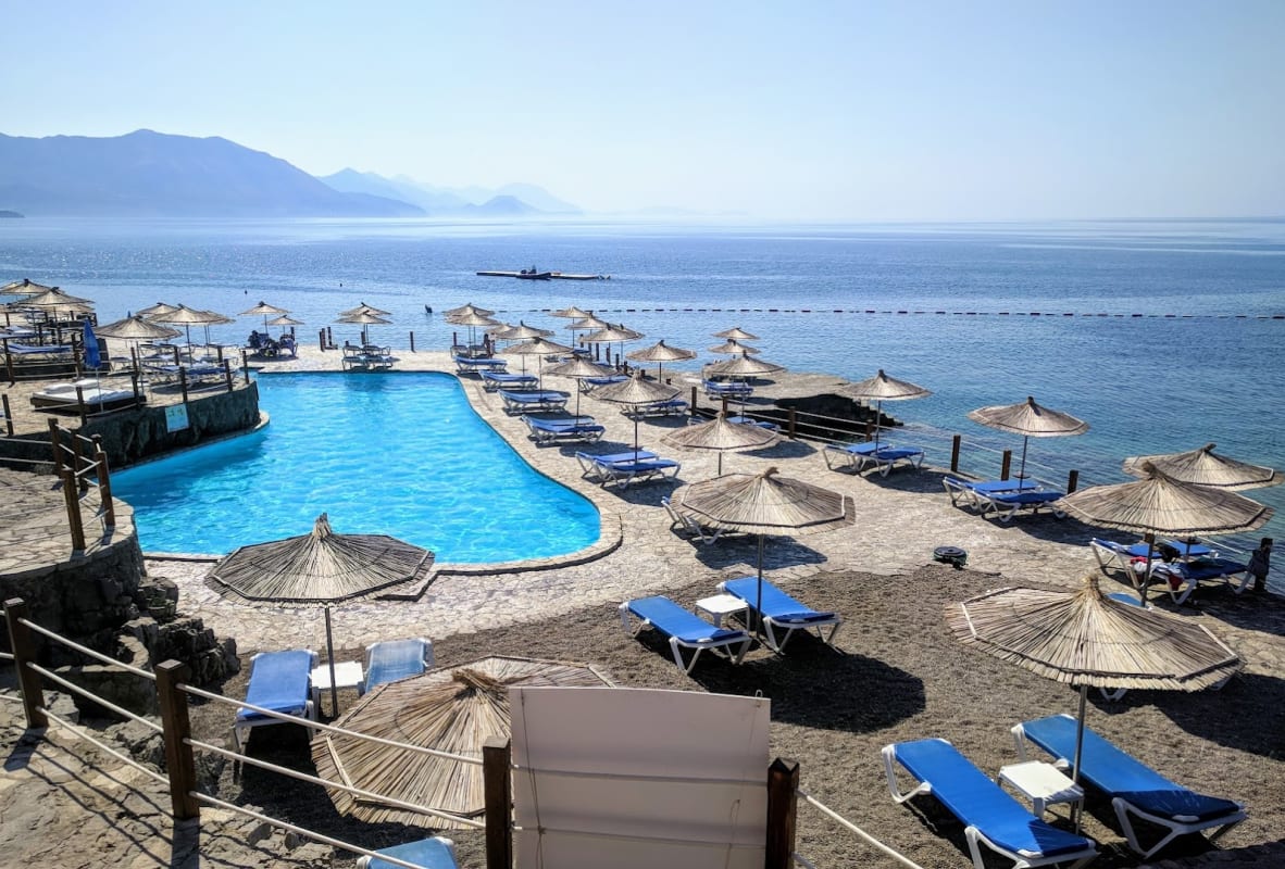 Ploče n'est pas une plage traditionnelle — c'est un promontoire rocheux à l'est de Budva avec des terrasses en béton et quatre piscines d'eau salée creusées dans la roche à différents niveaux. Le site fonctionne comme un beach club, avec de la musique DJ toute la journée, un service de cocktails aux chaises longues et des soirées mousse programmées. Les prix des chaises longues figurent parmi les moins chers de la Riviera lorsqu'ils sont associés à un achat de nourriture ou de boisson. L'eau profonde au large des rochers convient aux nageurs expérimentés ; les piscines offrent une option plus calme pour ceux qui préfèrent ne pas nager en mer ouverte. La foule est plus jeune que sur les plages familiales.
