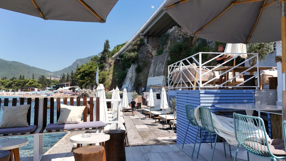 Strandclub tagsüber an der Budva-Uferpromenade mit Sonnenliegen, Cocktails und DJ-Sets.