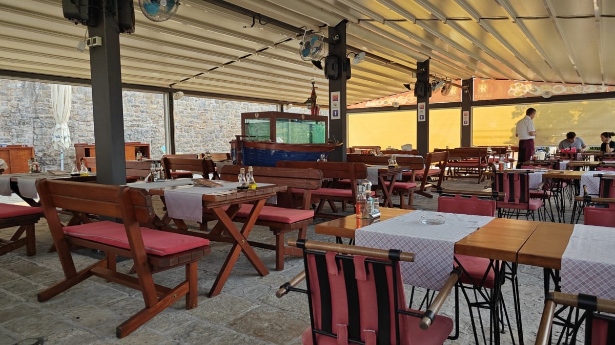 Regina E liegt in der Nähe der Segelyachtmarkt auf der Westseite von Budva, abseits des Haupttouristenplatzes um den Slovenska Beach. Die Küche konzentriert sich auf einen holzbefeuerten Grill und Ofen, der ganze Fische, mit Garnelen gefüllte Kalmare und holzgebackene Fladen herstellt. Fisch wird am Eingang auf Eis präsentiert, damit Gäste vor dem Wiegen und Kochen wählen können – ein Format, das an der Dalmatischen Küste verbreitet ist, aber in Budva weniger Standard ist. Die Tische am Marinenufer fangen den Sonnenuntergang direkt, ohne das Gebäudehindernis, das Restaurants weiter entlang der Promenade beeinträchtigt.