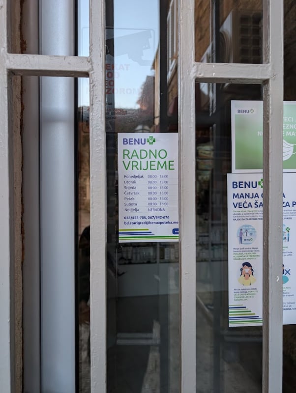 Benu Pharmacy est une succursale de la chaîne BENU sur Stjepana Mitrova Ljubiše, à proximité de la Vieille Ville de Budva. Le magasin est ouvert de 9 h à 15 h et propose des médicaments sur ordonnance, des produits en vente libre et des articles de soins personnels. Les cartes de crédit, les cartes de débit et les paiements sans contact NFC sont acceptés. Les horaires d'ouverture limités rendent cette succursale particulièrement adaptée aux visites matinales. Le site BENU ouvert 24 heures près de la gare routière assure la dispensation tard le soir et la nuit.