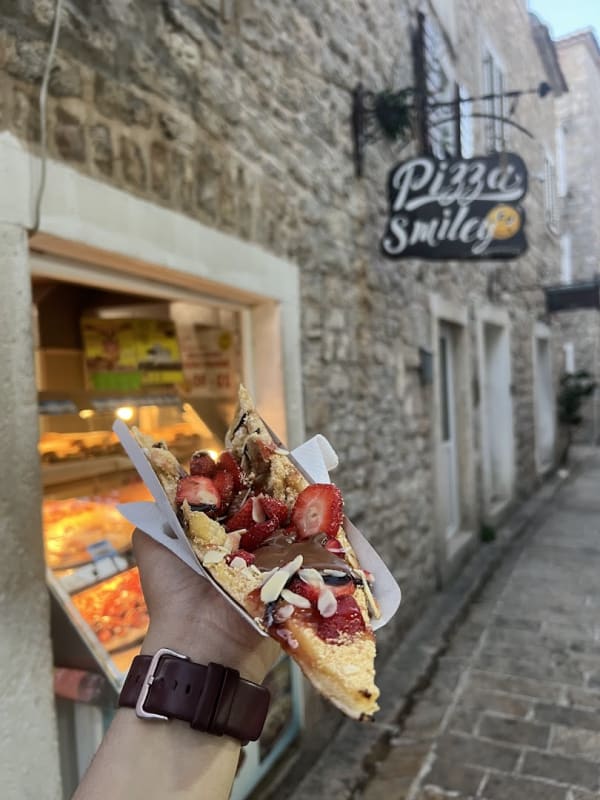 Pizzeria Smiley vende pizza al taglio da una finestra di asporto in un vicolo stretto della Città Vecchia. Le fette sono grandi — ben oltre la dimensione standard — e prezzate a €3–€4 ciascuna. La capricciosa e la pizza nera sono scelte ricorrenti, e le pizze dolci con frutta aggiungono qualcosa di insolito all'offerta. Nessun posto a sedere; ordina alla finestra e vai. Solo contanti. Code si formano durante le ore di punta.
